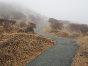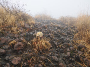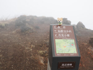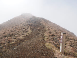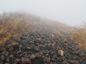 仙酔峡登山口に一番乗り。今日は平日だし、天気は午後に回復するけど午前は曇りなので登山者は少なそう(実際はたくさんの登山者がいらっしゃいました)。まずは高岳へ。しかし、いきなり中岳方向の登山口と間違えてしましました。改めて高岳に向けてリスタート。霧で視界が遮られます。