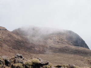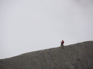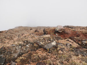 霧の中、ひたすら岩場を登り、尾根に到着。ここを左方へ。まずは高岳東峰を目指します。