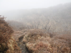 高岳に向かい月見小屋方面に下る。霧は晴れないが薄くなってきた!