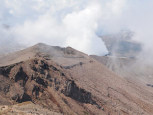 霧に隠れているものが見えてくると、、、おっと!これはすごい景色。中岳 第1火口。噴気は上がっていないけど活動中らしい。火口の底が白っぽくなっているのは火山活動が比較的穏やかな状態のようです。もし活動が活発化すると、ここに湯だまりができたり、噴煙が上がるとのこと。