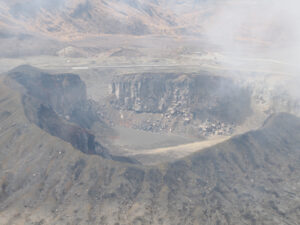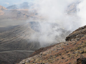東展望所から第7火口をみると火口の縁を歩いている人が(最大望遠400mm相当)。崩れたりガスが流れてきたら危ないぞ。