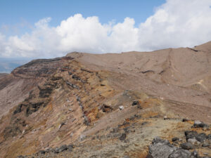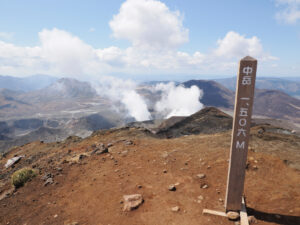 中岳に到着。第7火口をバックに撮影。火口東展望所に向け下ります。