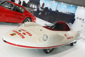 入口で最初に迎えてくれたのがフィアット・アバルト 750 レコード・モンツァ・ベルリネッタ。1950年代後半に速度記録(スピードレコード)を樹立するために開発された、空気抵抗を極限まで減らしたエアロダイナミクス・フォルムが特徴。ボディのデザインと製作はピンニンファリーナが担当