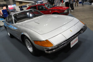 フェラーリ・デイトナ(正式名称:365 GTB/4)。ライバルだったランボルギーニ・ミウラがミッドシップを採用する中、FR(フロントエンジン・リアドライブ)レイアウトを採用。4.4L V型12気筒エンジンを搭載。最高出力は 352馬力、最高速度は当時世界最速クラスの 280km/h