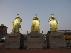 明日の高知駅待ち合せ場所を確認しに行く途中に高知の幕末三志士像がライトアップ!