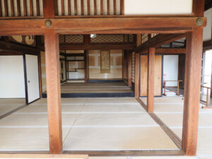 本丸御殿の中。書院造で藩主が座る上段の間(奥)と家臣が控える畳敷き(手前)です。