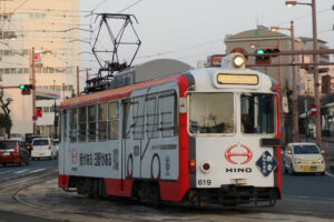 とさでんの主力車両600形(619号)朝倉行。日野自動車(高知日野自動車)の広告車両。高知はいすゞより日野のトラックが多い気がします。