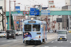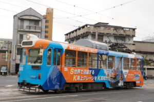災害に備えよう 防災電車」としてラッピングされた800形(804号)ごめん行。山陽電気軌道から譲渡された車両です。