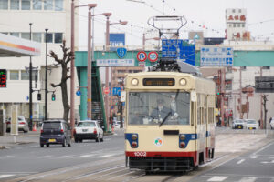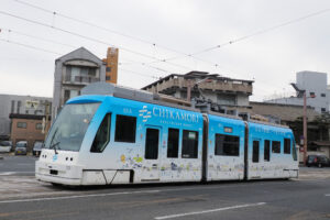 超低床電車ハートラム(100形 101号)文珠通行。バリアフリーに対応した3車体連結のLRT車両。1時間足らずで上下合わせてこれだけの写真を撮影できました。
