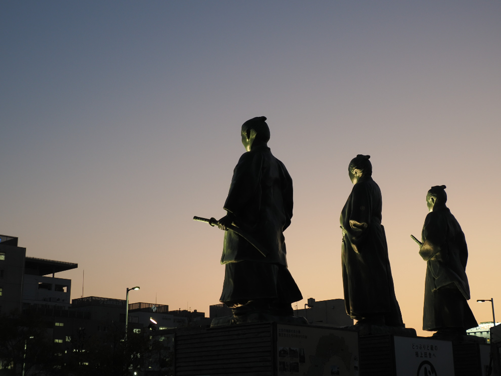 左から市川半平太(土佐勤王党の盟主)、坂本龍馬(薩長同盟や大政奉還推進など日本の夜明けに奔走)、中岡慎太郎(竜馬の親友で薩長同盟に尽力)です!後ろ姿も絵になるなぁ。