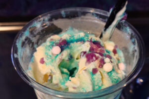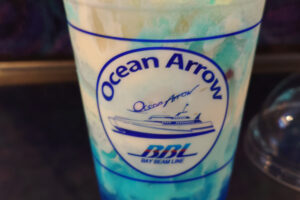 売店でオーシャンブルーフロートを購入。コーヒーを飲もうと思ったのですが、数量限定とのことで選択。海をイメージしたライチ風味の青いサイダー。ソフトアイスとパチパチはじけるキャンディがトッピングされています。