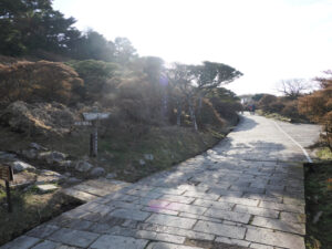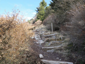 石畳の少し登るとすぐ左にロープウェイ妙見岳駅に通じる登山道あり。意外に急登