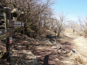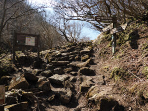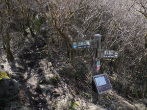 再び国見分れを経由して鬼人谷口の分かれ道へ。左のルート(新登山道)を進みます。