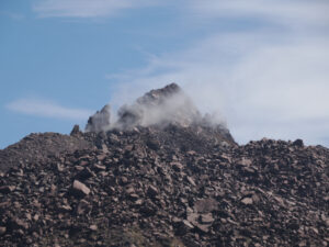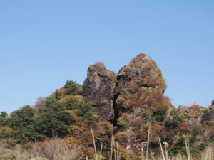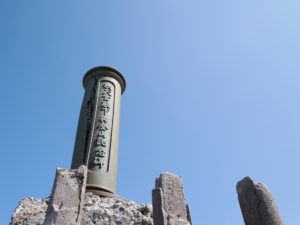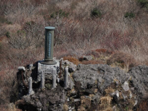 普賢岳の山頂(1,359m)にある「秩父宮殿下御登山記念碑」。昭和3年(1928年)に秩父宮殿下が雲仙に登られたことを記念して建てられたものです。歴史を感じさせる立派な碑ですが、左表面に大きな亀裂が。これは1990年から始まった平成の噴火活動による地殻変動や地震、あるいは降灰や熱などの影響で傷んだものといわれています。