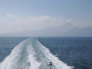 後部デッキに出ると普賢岳がぐんぐん遠ざかります。何せ30ノットですから。ウイングがついてまるでスポーツカー。細い先端が波を切る(波の抵抗が少ない)。双胴船(Catamaran)だから安定して揺れも少ないぞ。