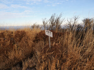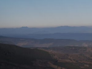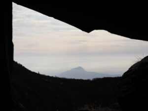 さらに10分で西峰(1014m)に到着。遠くにくじゅうの山々(左)と万年山(右)が望めました。