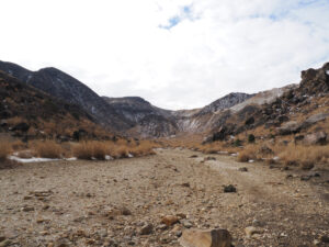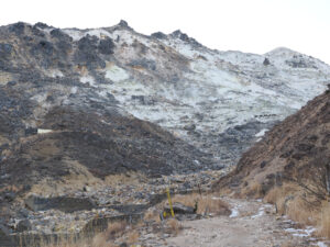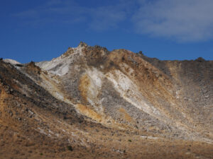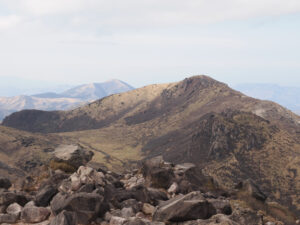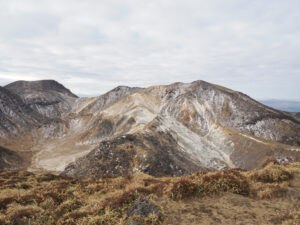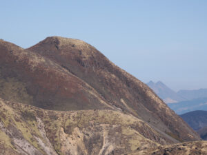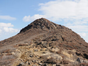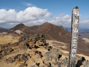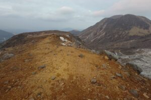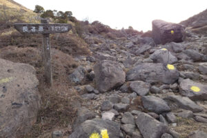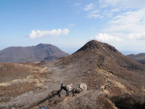 前面に硫黄山。谷を渡り諏蛾守越を目指し岩場を登っていきます。