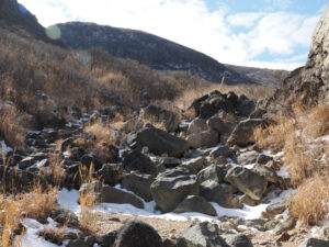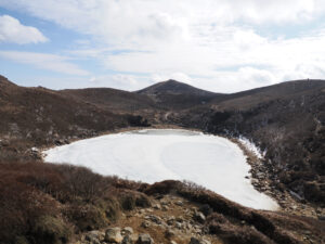 岩場の急登。右下を見ると湖面が凍った御池。氷上を歩く人あり。時間がないので泣く泣く御池をパス。