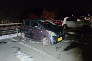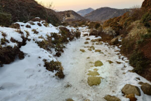 前回に続きくじゅう17サミッツ完全登頂を狙い、寮を午前2時に出発。夜の東九州自動車道、大分自動車道を突っ走り牧ノ戸登山口に到着。外気温はマイナス4℃。装備を整え出発(5:27)!