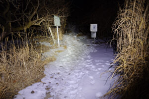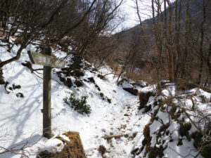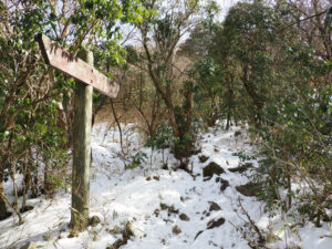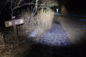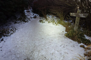 まずは大曲登山道まで夜道を下ります(5:57)。案の定、登山口を少し歩くと雪がありますが歩行に支障なし