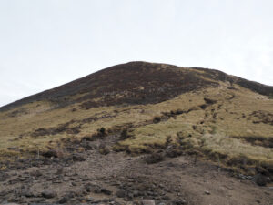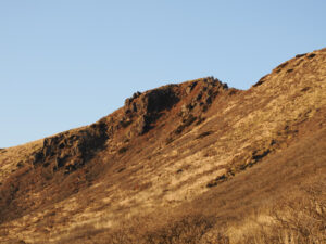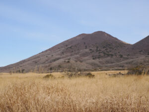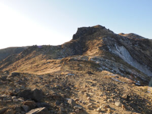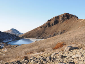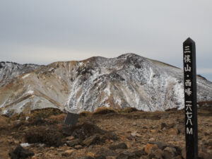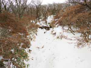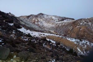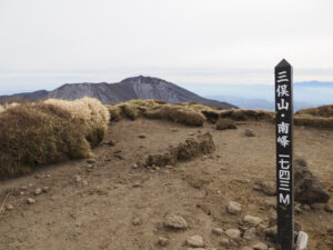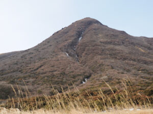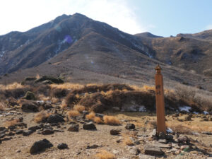 落差の大きな南峰の東側斜面を降り、三俣山登り口に到着。途中で手袋を落とし、探しに引き返したり(手袋ありました)。かなり疲れてきました。