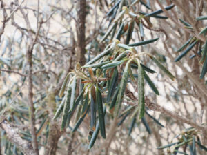 いたるところにツクシシャクナゲ。蒸散を防ぐため、葉が細く丸まっています。生存戦略