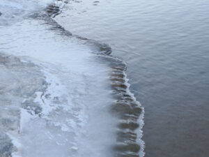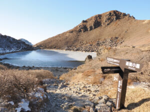 天狗ヶ城のたもとに御池が見えてきました(16:25)。気温は終日氷点下ですが、湖面全部は凍っていません。