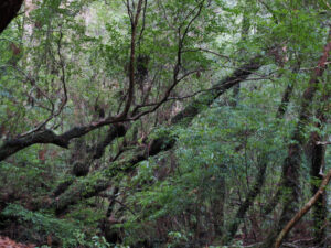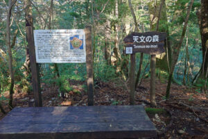 太忠岳の看板に沿って登ると標高1,200m付近に広がる広大な原生林『天空の森』。眺望はありません。