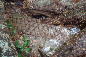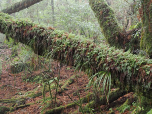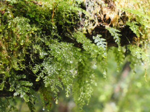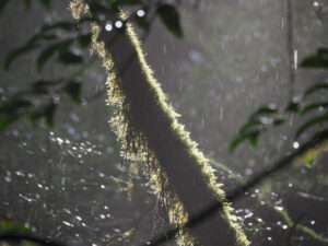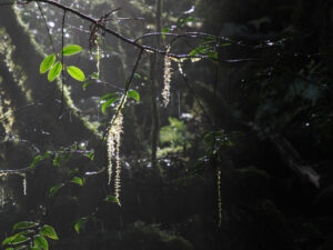 雨がやみ日差しが。雨粒が光を反射してキラキラと輝く中、枝から垂れ下がるサルオガセが逆光に照らされました。