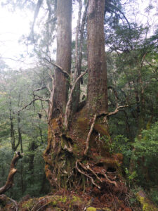 双子杉。2本の幹が並び、複雑に絡み合った根元からは、過酷な環境を生き抜く強靭な生命力が伝わってきます。