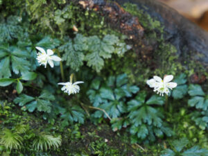 苔の間から糸のように細い雄しべが広がるオウレン