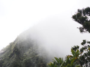 頂上付近はガスって見えません。
